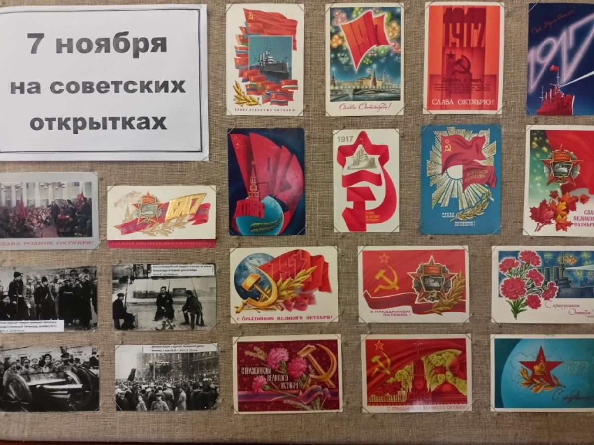 В Центральной городской библиотеке имени Л. Н. Никоновой открылась выставка-винтаж «7 ноября на советских открытках». В экспозиции представлены красочные почтовые карточки прошлого века, посвященные Дню Октябрьской революции.