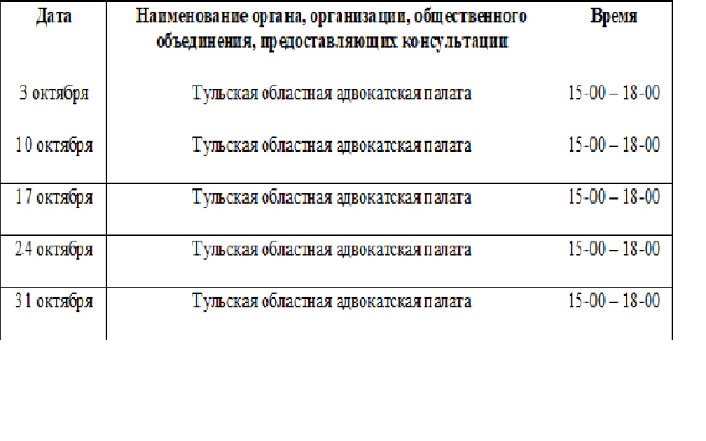 График предоставления Тульским региональным отделением Общероссийской общественной организации «Ассоциация юристов России» юридических консультаций в приемной Правительства Тульской области на октябрь 2023 года.