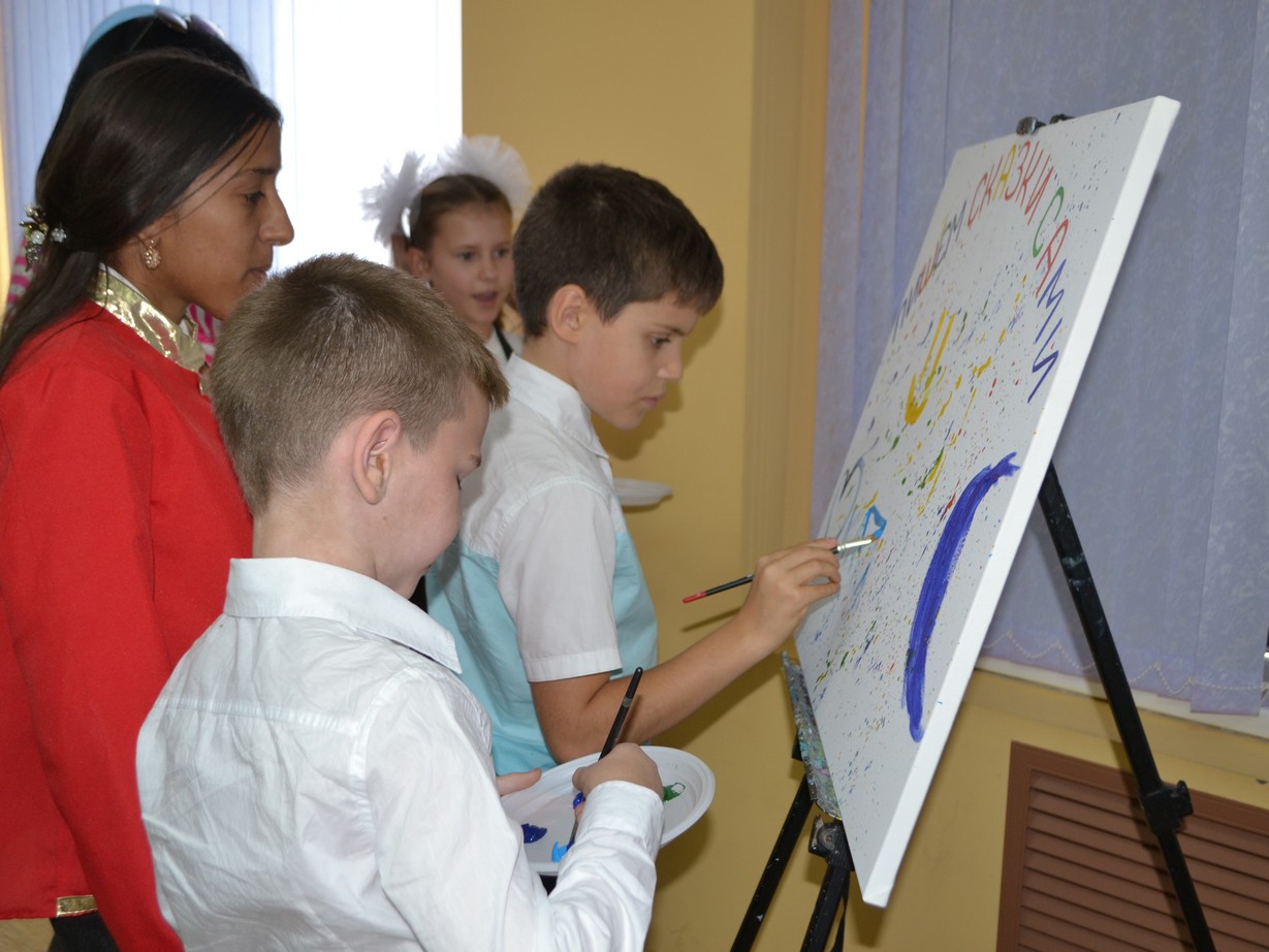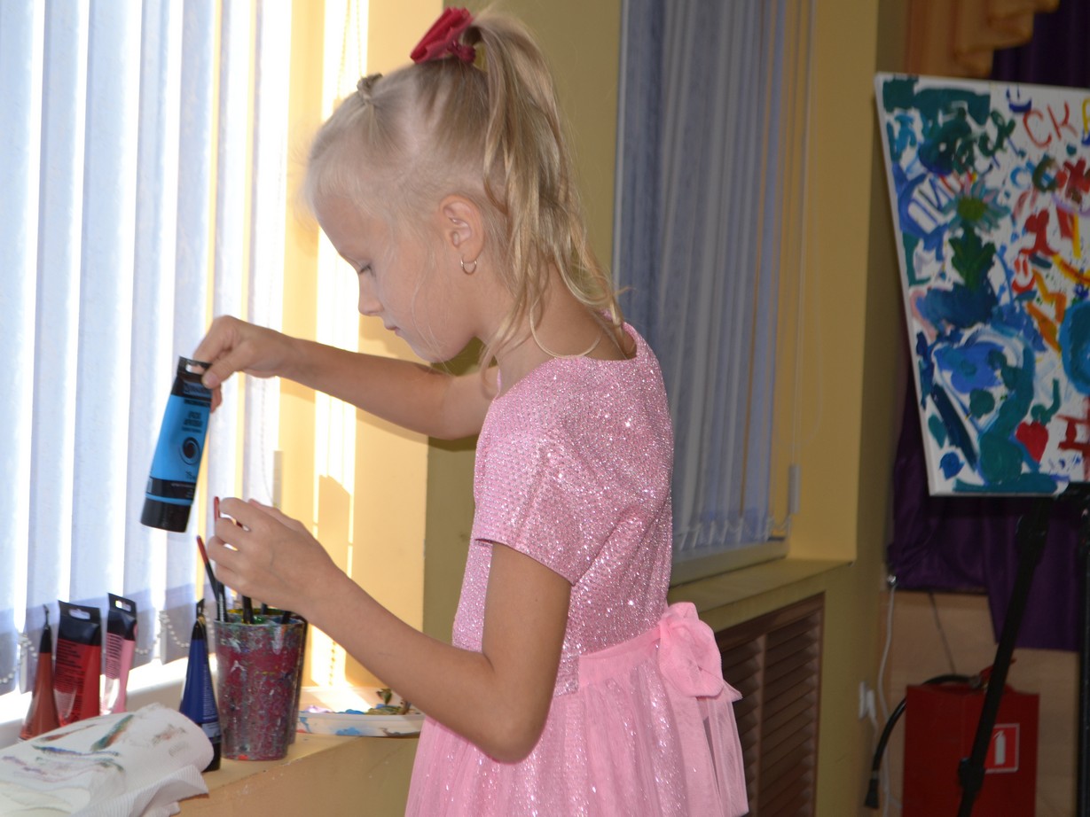 Перед торжественным концертом маленькие писатели попробовали себя в роли художников, нарисовав на холсте в зале совместную картину. Каждый из них постарался изобразить там своих сказочных героев.