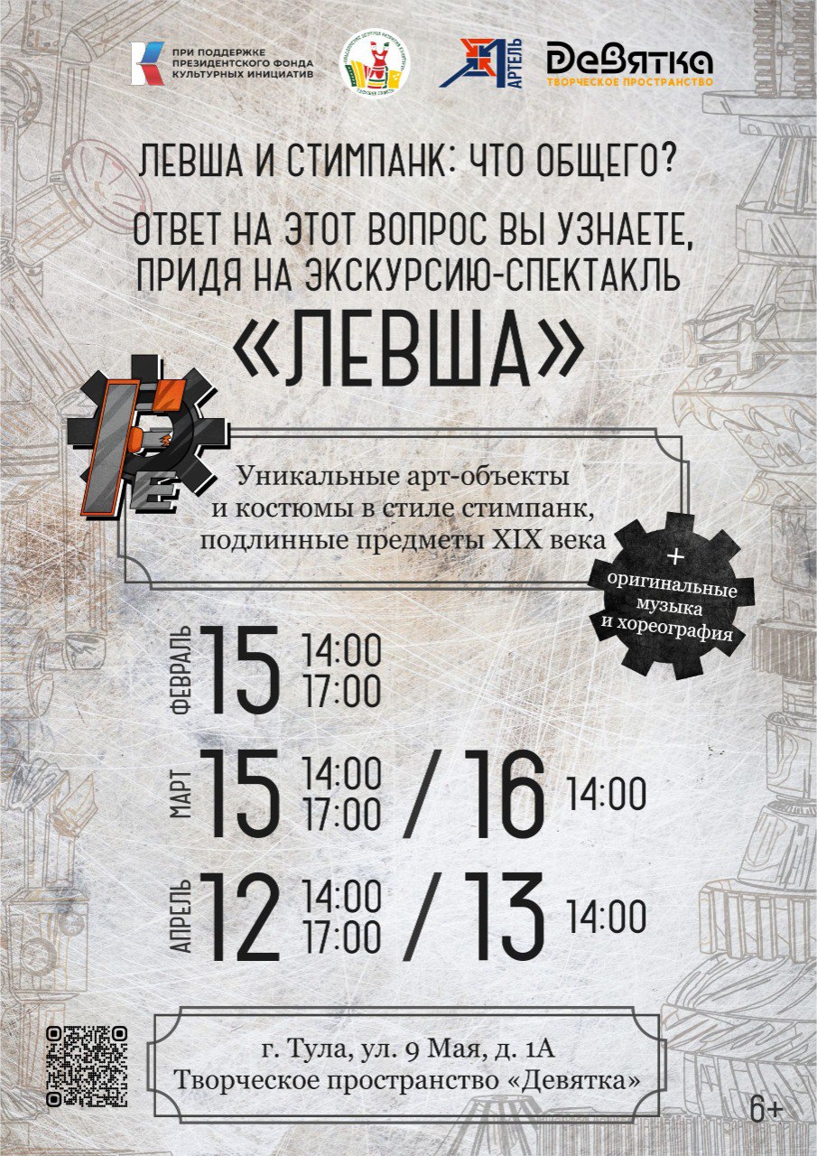 15 февраля в творческом пространстве «Девятка» состоится премьера экскурсии-спектакля «Левша», подготовленного для III фестиваля стимпанк-культуры «Ferrum».