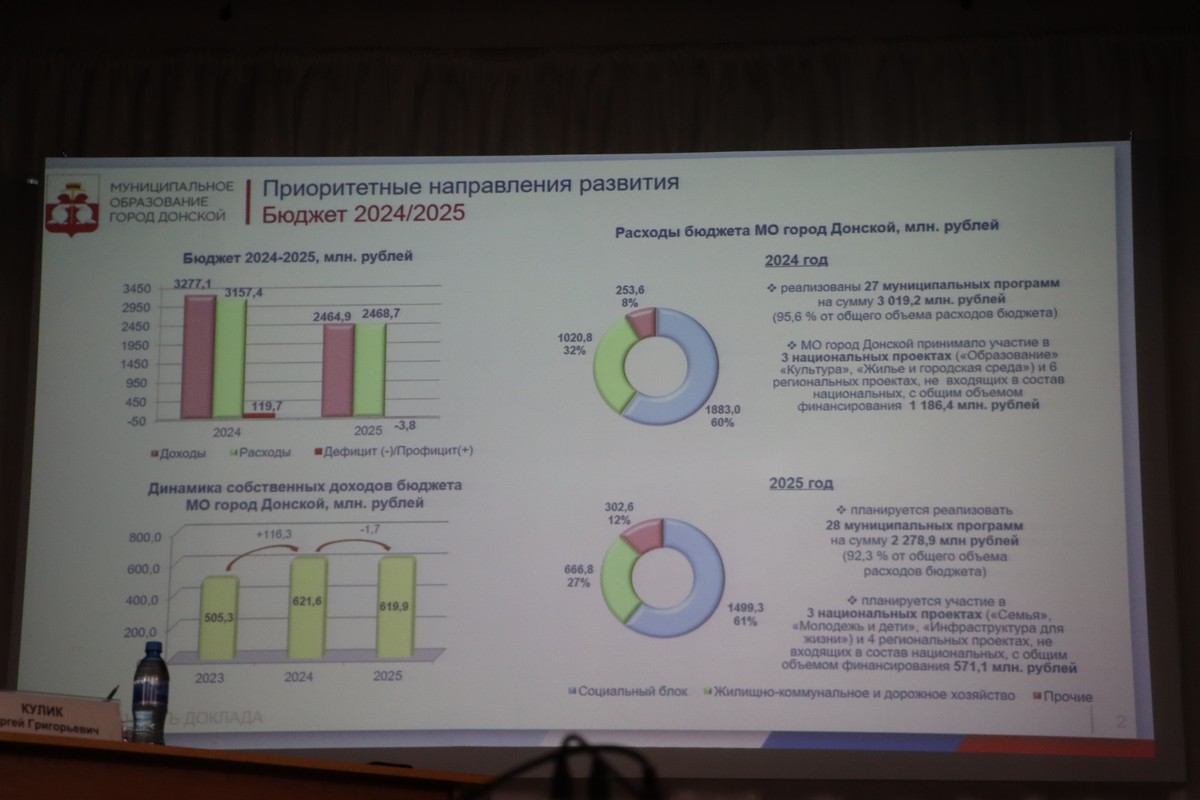 – Один из ключевых показателей эффективности работы — бюджет. В 2024 году доходы составили 3,277 млрд рублей, расходы — 3,157 млрд, профицит — 119,7 млн рублей. В 2024 году Донской участвовал в 12 региональных программах. В 2025 году доходы планируются на уровне 2,465 млрд, расходы — 2,469 млрд, дефицит — 3,8 млн рублей. Собственные доходы выросли на 16,3% по сравнению с 2023 годом, – сказал глава администрации.