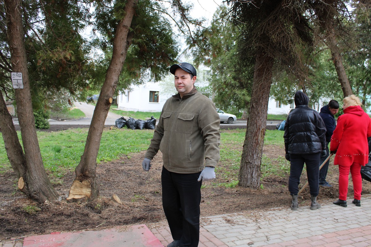 Глава администрации города Донского Сергей Кулик, как и обещал, также пришел сюда, чтобы присоединиться к жителям микрорайона и принять участие в субботнике.