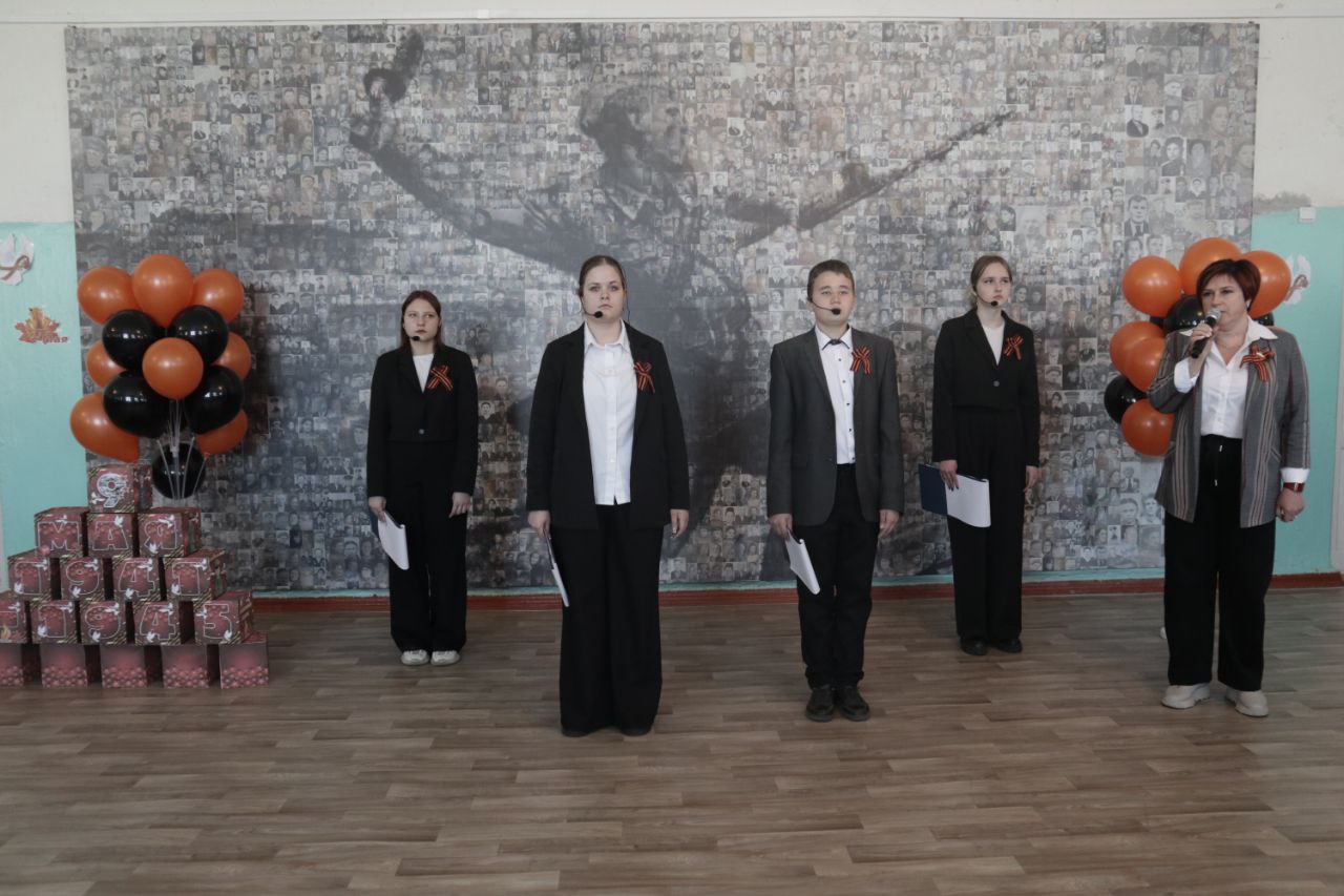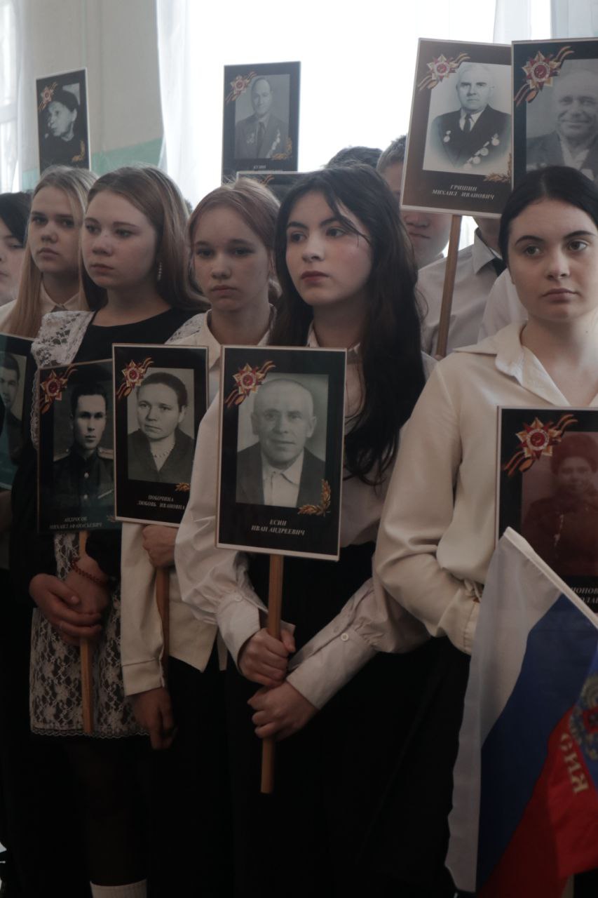 Особое внимание было уделено ветеранам Великой Отечественной войны и труженикам тыла, чьи заслуги и вклад в общую победу были подчеркнуты. Учащиеся 5-9 классов несли штендеры с фотографиями ветеранов, являющихся родственниками учащихся, учителей и выпускников школы. Память павших героев была почтена минутой молчания.