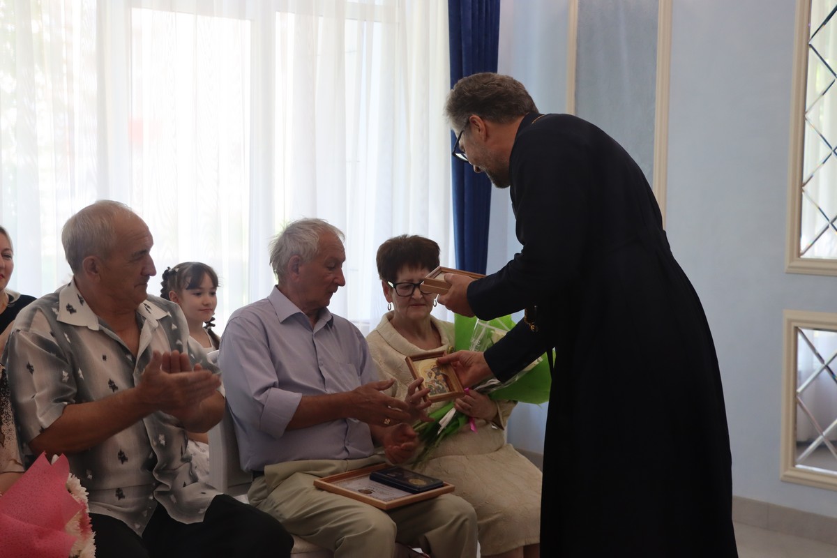 Также юбиляров поздравил благочинный церквей по Новомосковскому, Куркинскому округам и городу Донскому протоиерей Владимир Лысиков. Он назвал «золотые» пары Донского героями дня и подарил им иконы с изображением святых покровителей брака – Петра и Февронии.