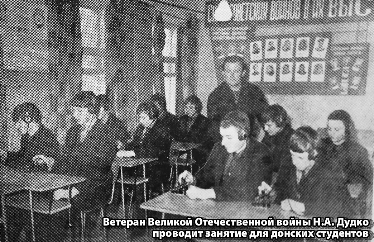 «В определенные дни комната боевой славы становится учебной аудиторией, где ребята готовятся стать радиотелеграфистами. Готовят их бывшие воины И.И. Бусалаев, В.И. Михайлин, Н.А. Дудко…