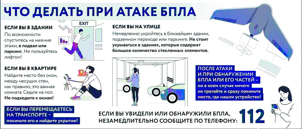 О том, что делать, услышав хлопки в небе или увидев оповещение об угрозе приближения украинских беспилотников смотрите в приложенном баннере.