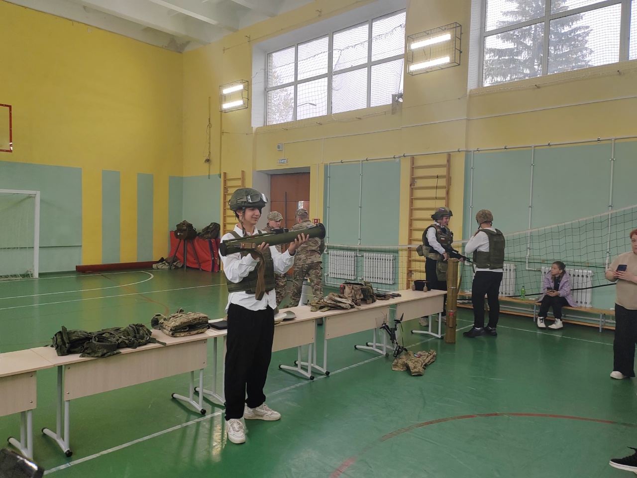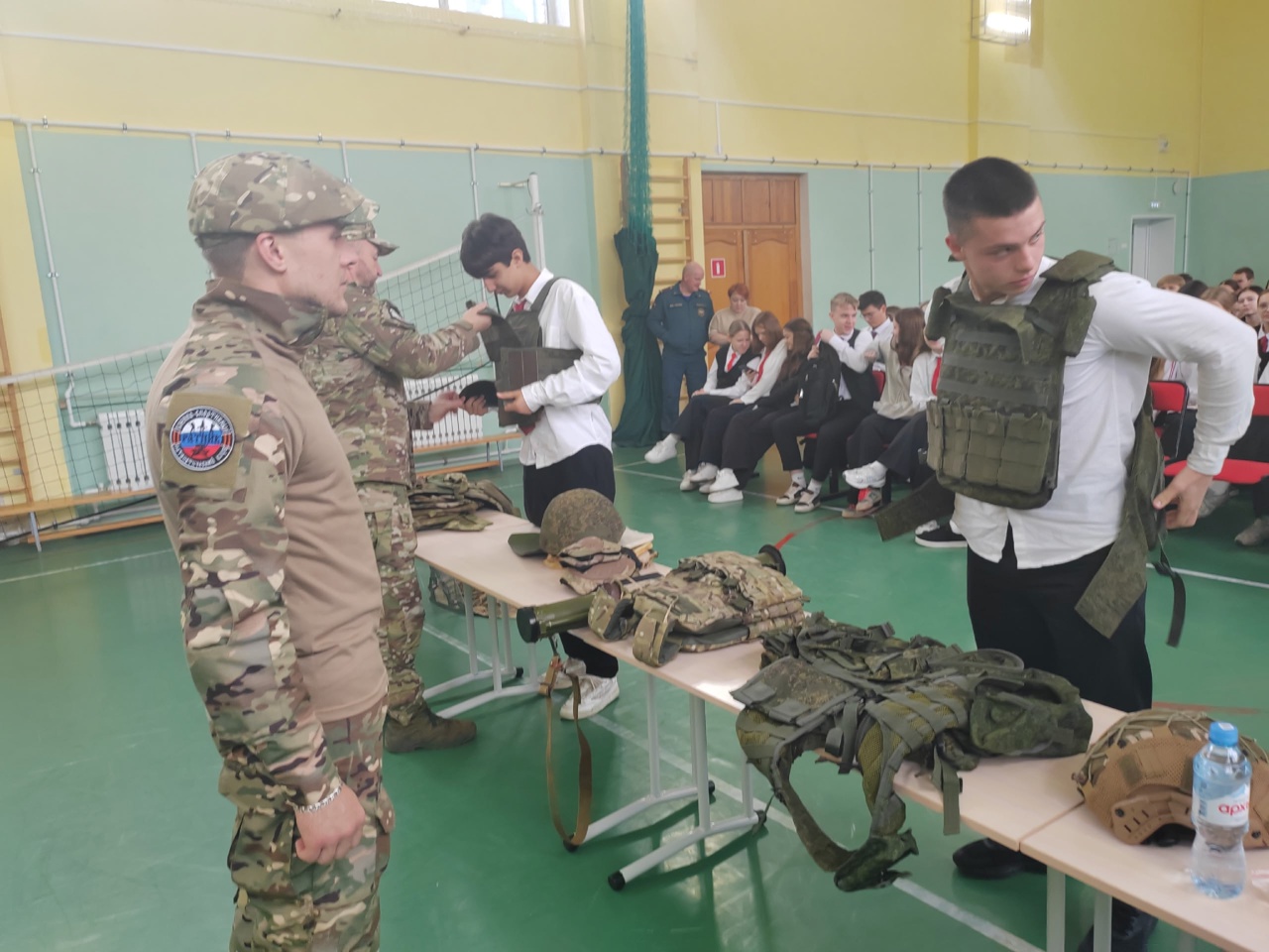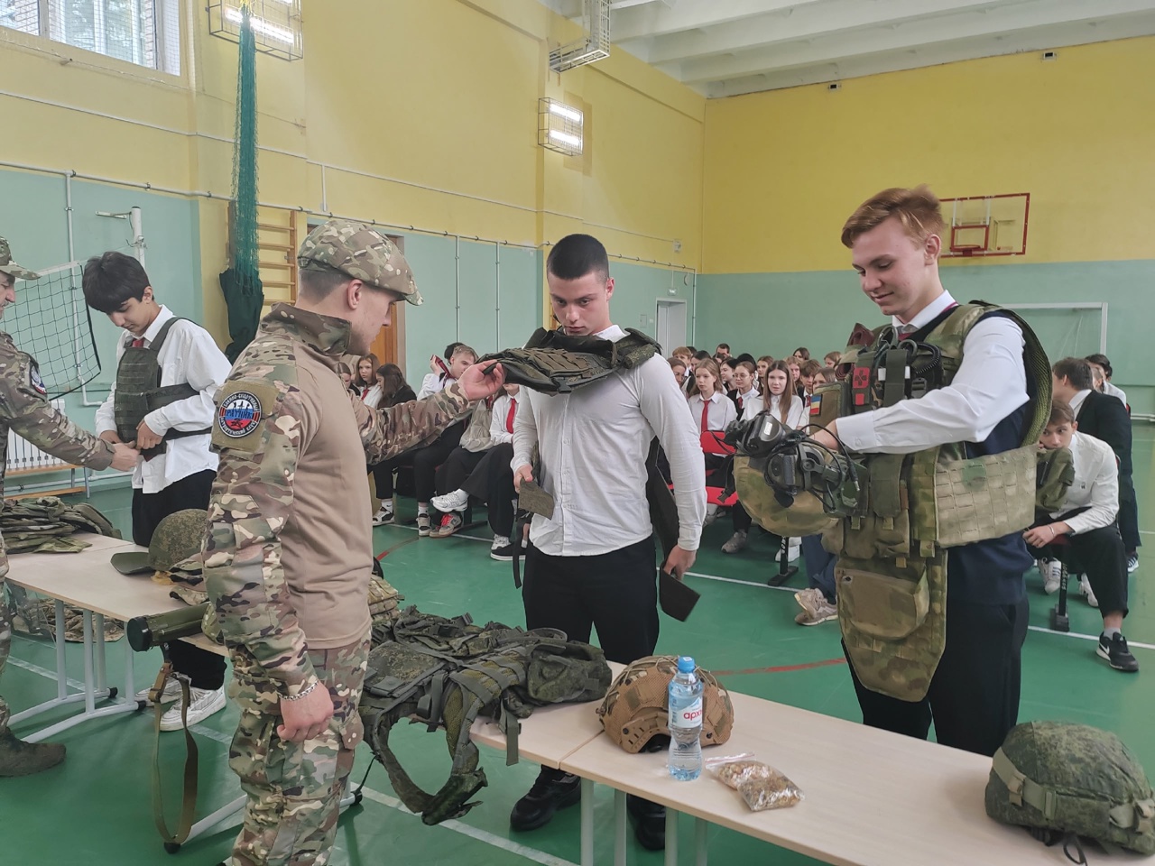 Затем войсковой старшина перешел к демонстрации элементов защитной амуниции и вооружения солдат современной российской армии. Старшеклассники с большим интересом наблюдали за этим, после чего им была дана возможность не только взять в руки броню и неактивное учебное вооружение, но и примерить все это.