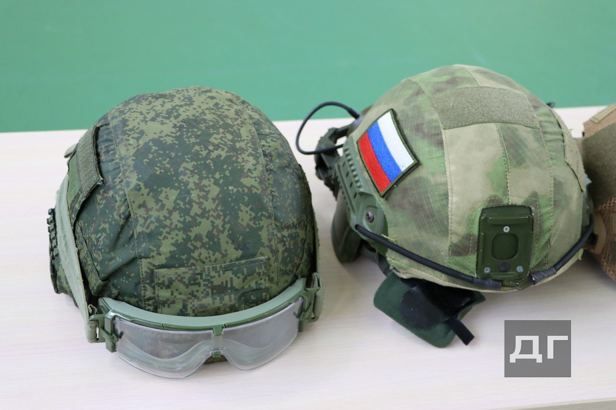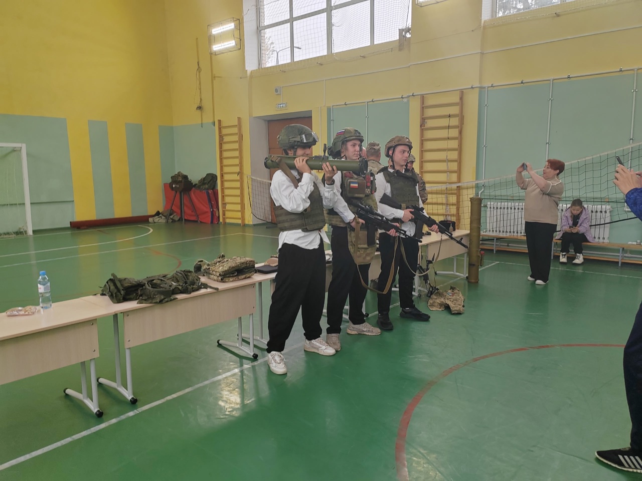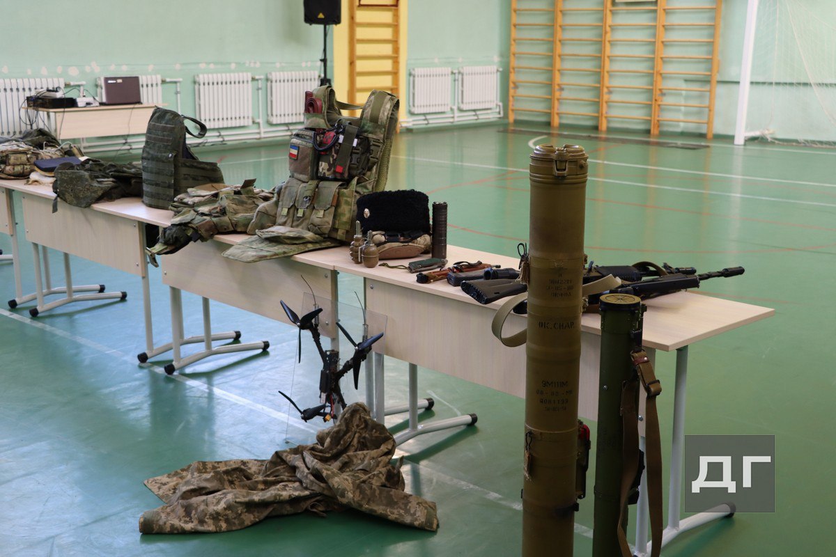 Затем войсковой старшина перешел к демонстрации элементов защитной амуниции и вооружения солдат современной российской армии. Старшеклассники с большим интересом наблюдали за этим, после чего им была дана возможность не только взять в руки броню и неактивное учебное вооружение, но и примерить все это.