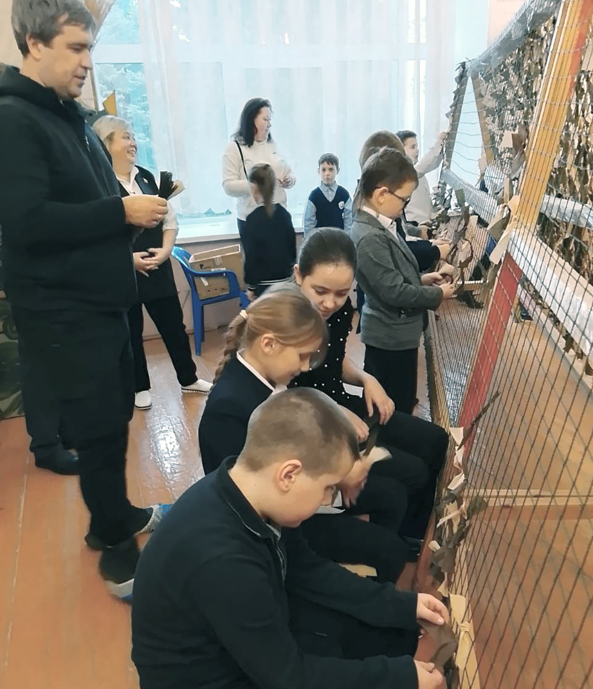 Мероприятие прошло в Центре культуры и досуга Северо-Задонска, и одним из его организаторов стала преподаватель школы № 13 Венера Чачина. Ученики и родители узнали о значении маскировочных сетей и освоили технику плетения. Папы и мамы нарезали полосы из камуфляжной ткани, а дети помогали с материалами. Готовые сети упаковывали и передавали волонтёрским штабам для отправки в зону СВО.