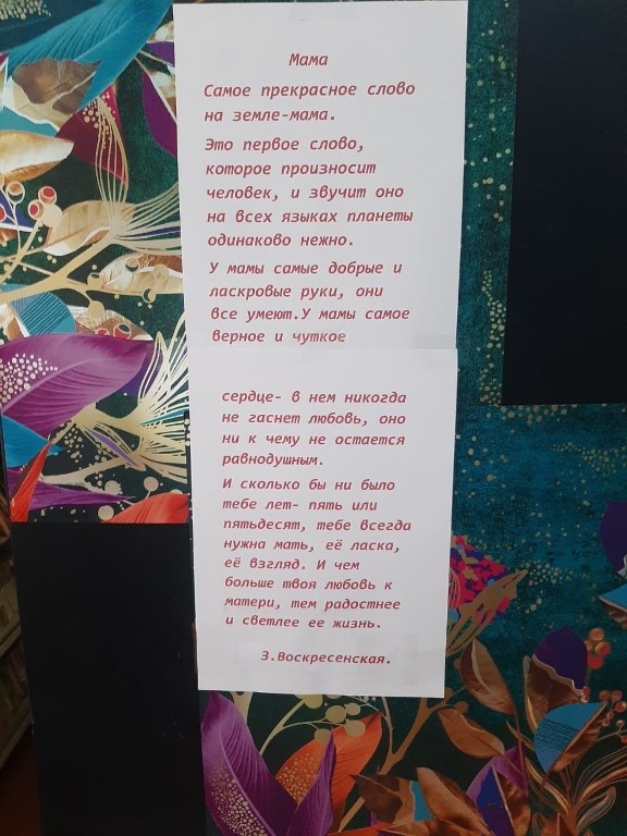 Юные читатели библиотеки посетили выставку. Библиотекарь рассказала детям о том, что мама — это источник тепла, любви и безопасности. Ребята активно делились своими мыслями о мамах, описывая их с большой теплотой и любовью.