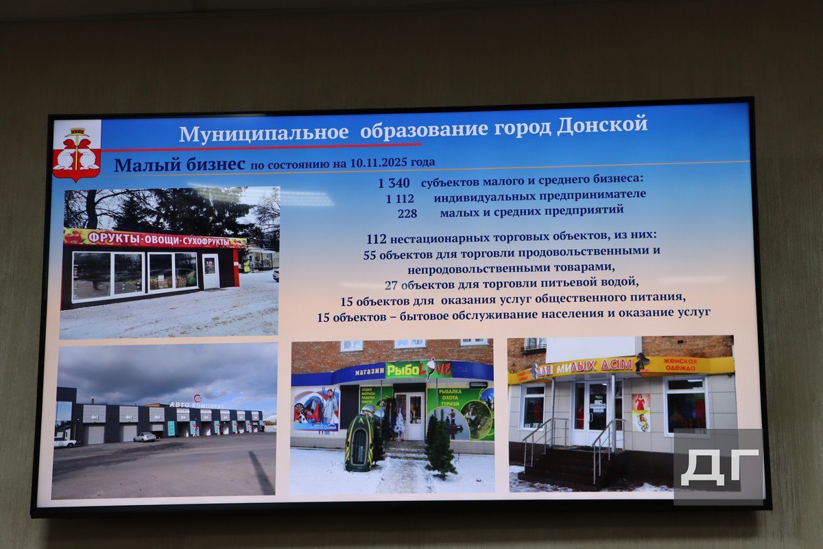 Количество субъектов малого и среднего предпринимательства в Донском составило 1368, из них 236 малых и средних предприятий и 1132 индивидуальных предпринимателя. В городе зарегистрировано 228 малых и средних предприятий и 1112 индивидуальных предпринимателей. Снижение количества субъектов обусловлено увеличением числа самозанятых граждан.