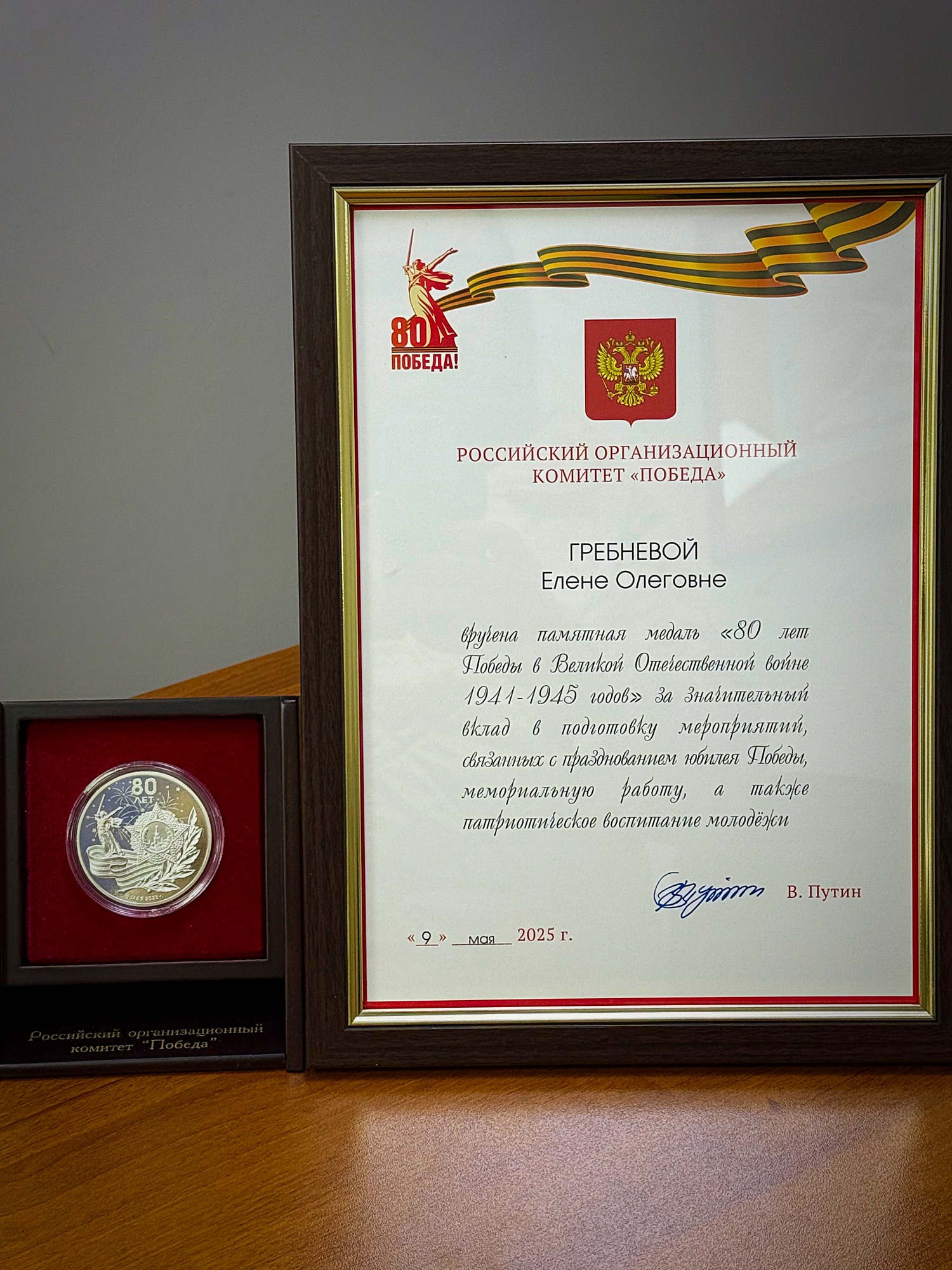 За значительный вклад в подготовку мероприятий, связанных с празднованием юбилея Победы, мемориальную работу, а также патриотическое воспитание молодежи памятная медаль и письмо к ней за подписью Президента Российской Федерации Владимира Путина вручена депутату Тульской областной Думы, региональному координатору гражданской инициативы «Бессмертный полк» Елене Гребневой.