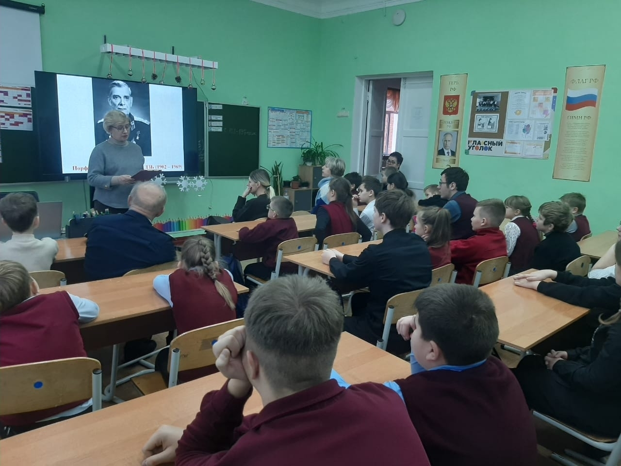 Школьники узнали героическую биографию Героя Советского Союза, полковника Порфирия Мартыновича Гудзя, командира 328-й стрелковой дивизии, похороненного по завещанию вместе с бойцами своей дивизии в братской могиле № 2 в Донском.